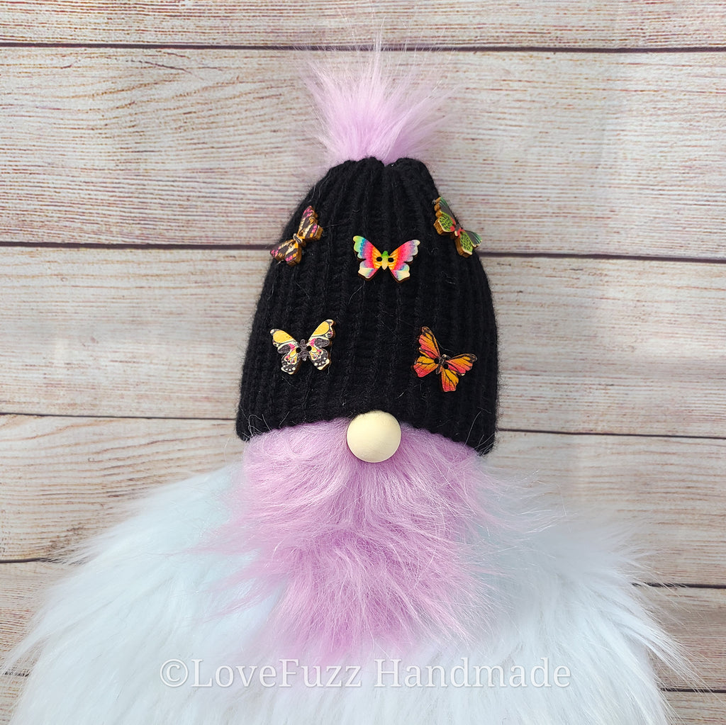 Knitted plush gnome with a black hat decorated with butterfly buttons and a fluffy light purple beard. Stands approx 6 inches tall with a weighted base.
