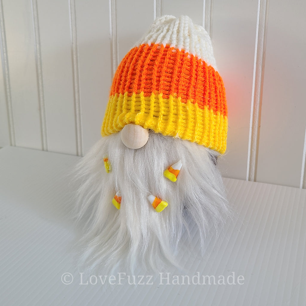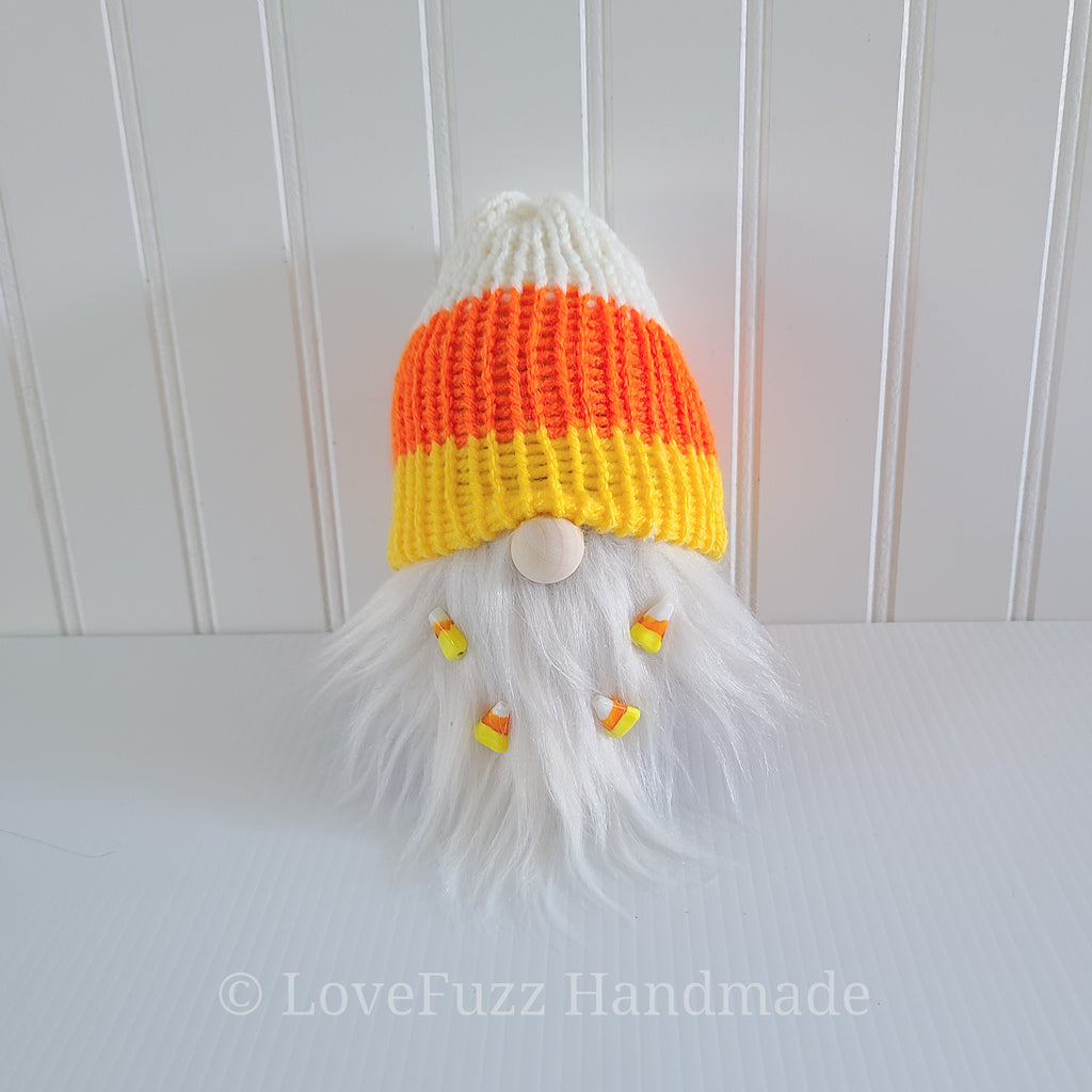 Knitted plush gnome with a striped candy corn hat and tiny glass candy corn stuck in his with a fluffy cream colored beard. Stands approx 6 inches tall.