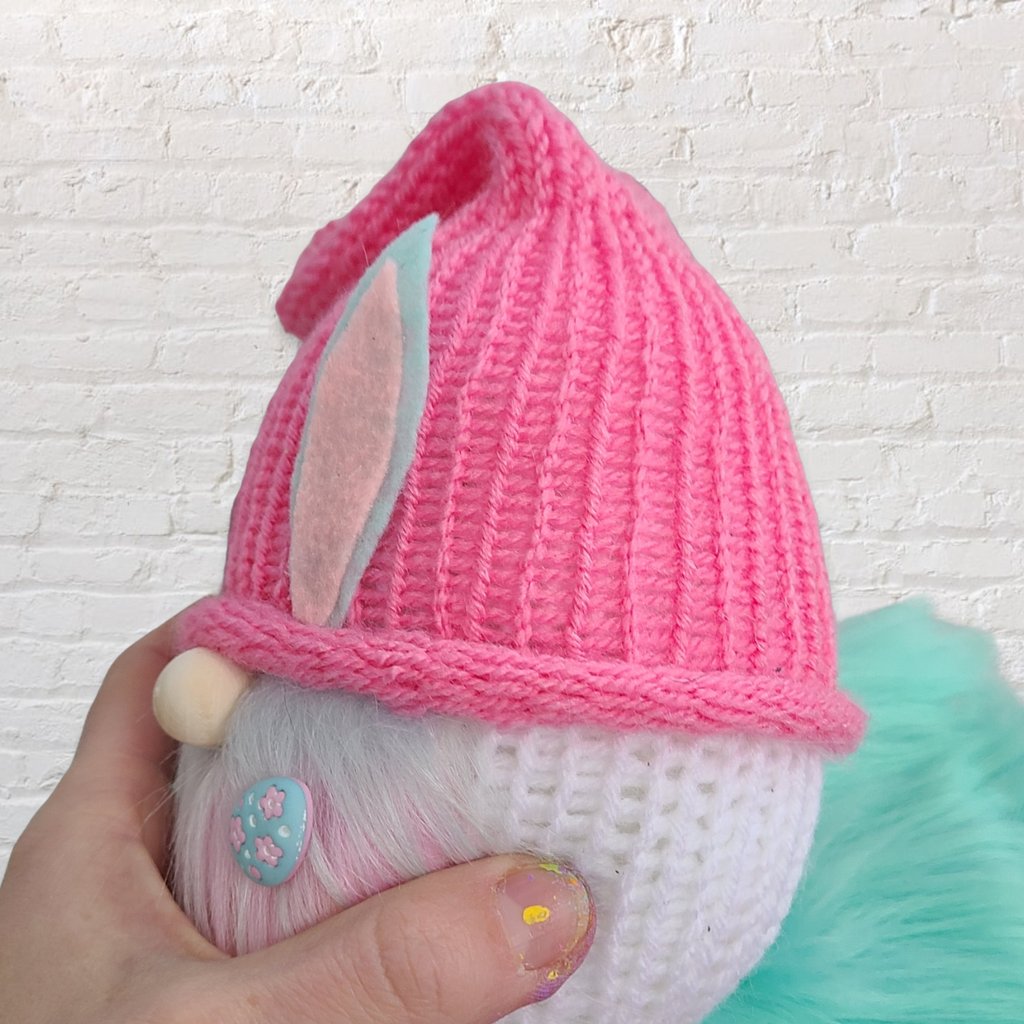 Handmade knit little Easter bunny gnome with a pink hat, pastel rainbow beard, cute little bunny ears, and an Easter egg.
