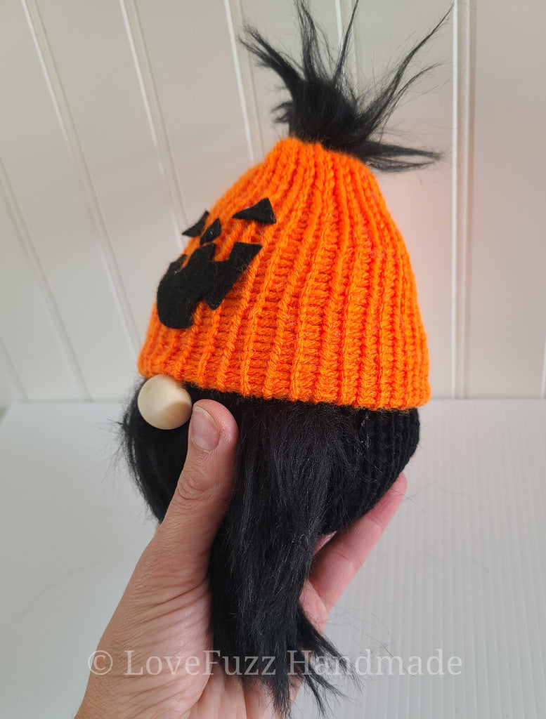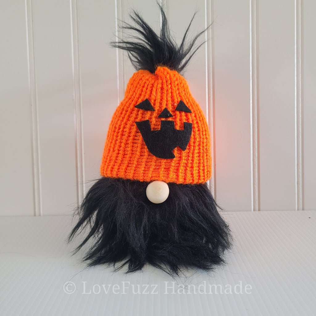 Knitted plush gnome with a black beard and happy Jack 'o' lantern hat. Stands approx 6-7 inches tall.Â