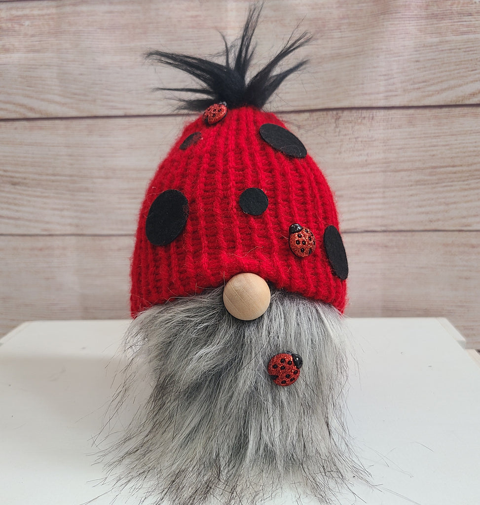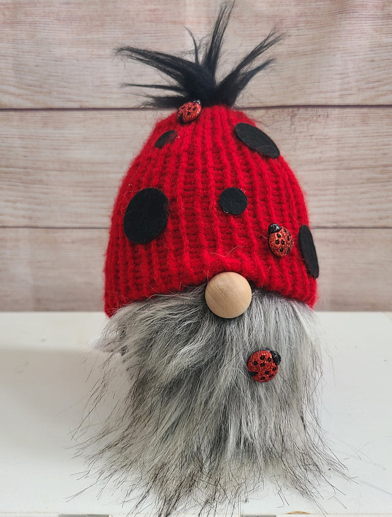 Knitted plush gnome with a spotted ladybug hat and a fluffy graying beard with 2 little ladybug friends along for the ride. Stands approx 6-7 inches tall.