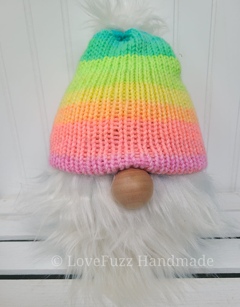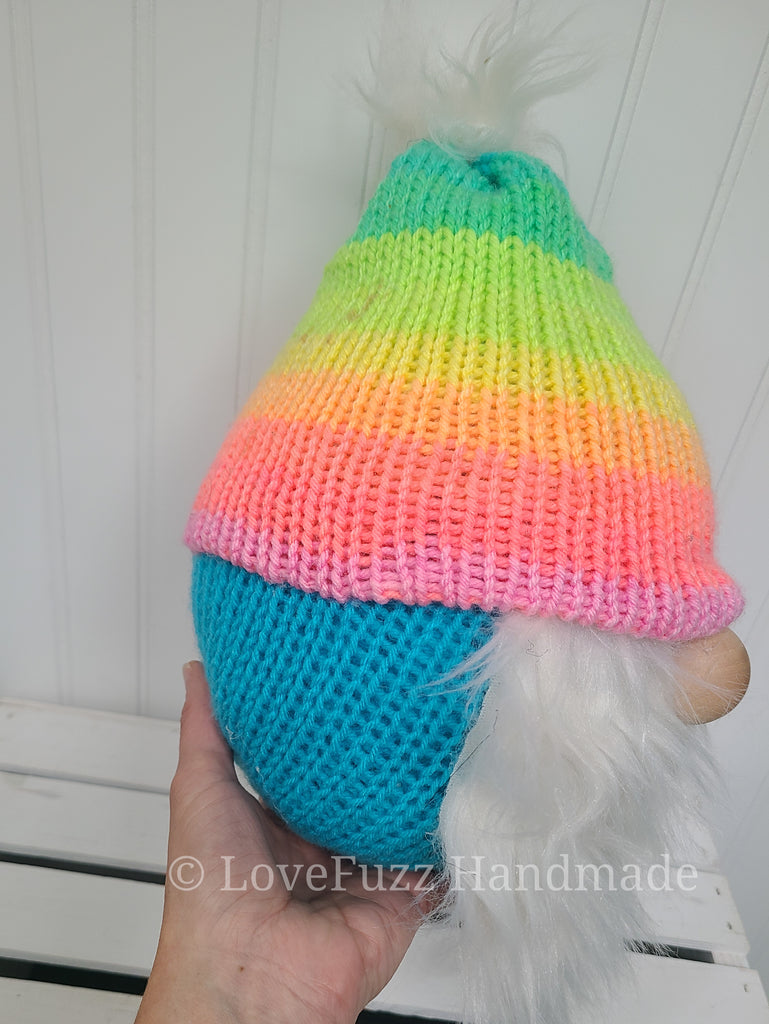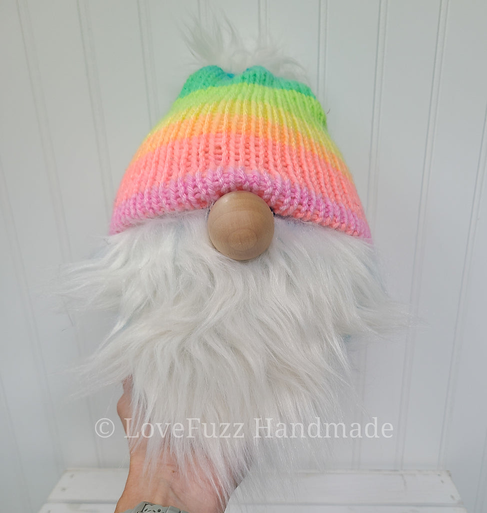 Knitted plush gnome with a bright pastel rainbow hat and a fluffy white beard. Stands approx 10 inches tall with a weighted base.