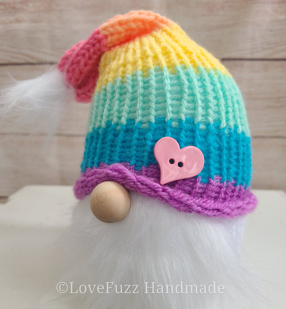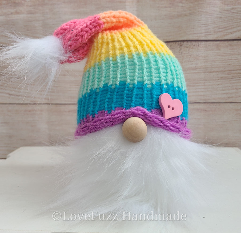 Knitted plush gnome with a bright pastel rainbow hat, fluffy white beard, and a cute coordinating heart button. Stands approx 8 inches tall with a weighted base.