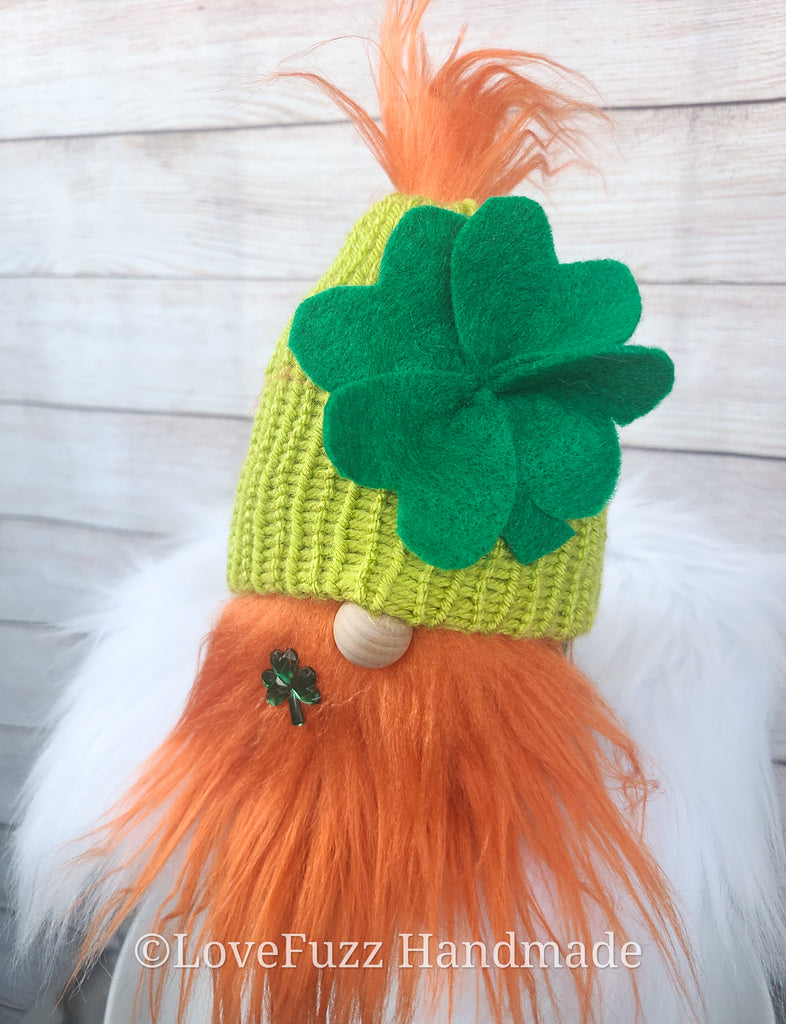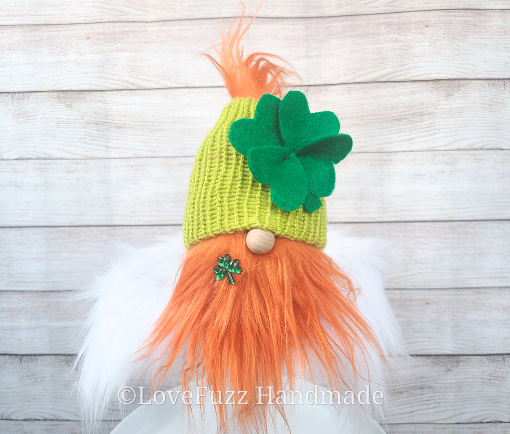 Knitted plush gnome with a fluffy bright orange beard with a sparkly shamrock and green hat with a large felt shamrock. Stands approx 7 inches tall.