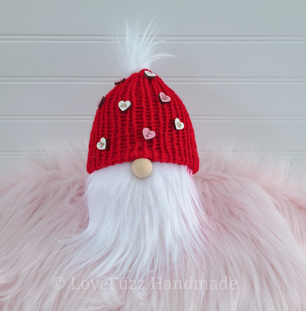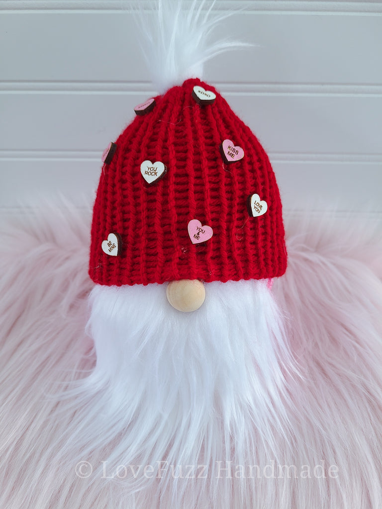 Knitted plush Valentine gnome with a red hat covered in cute wooden conversation heart candies. Stands approx 6-7 inches tall and 4 inches wide with a weighted base.