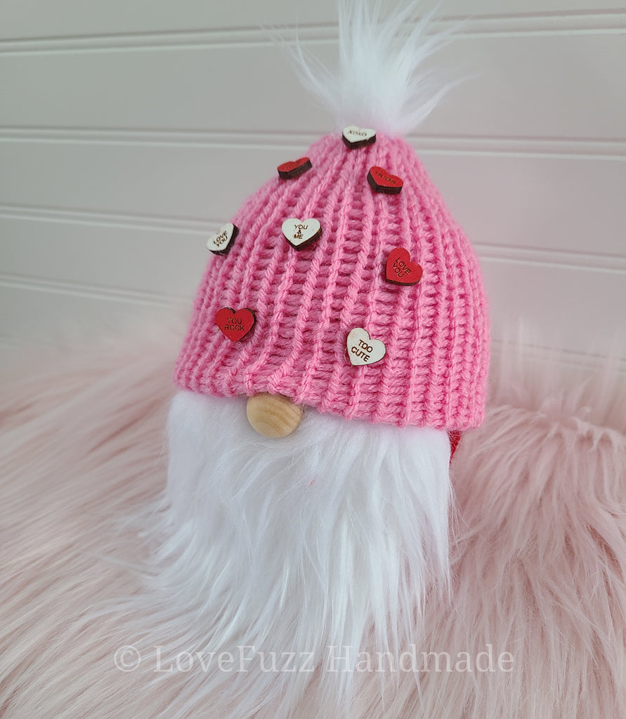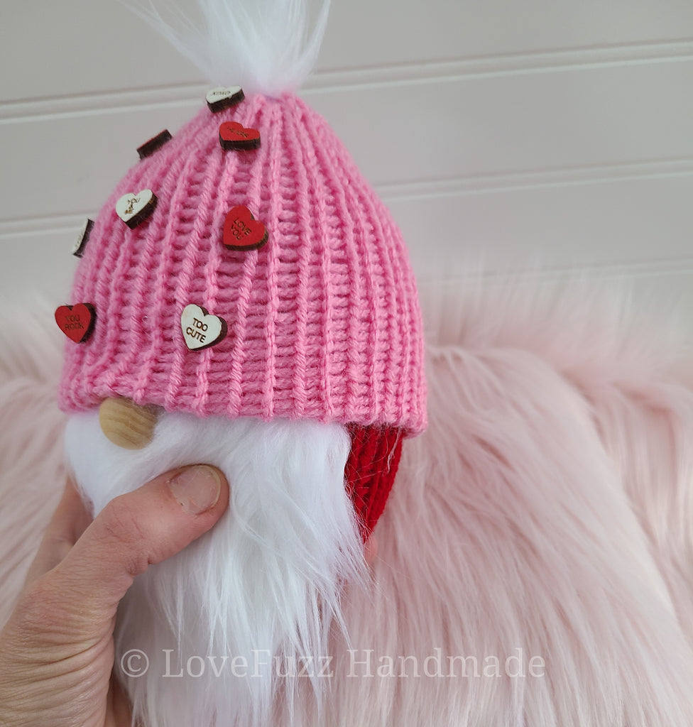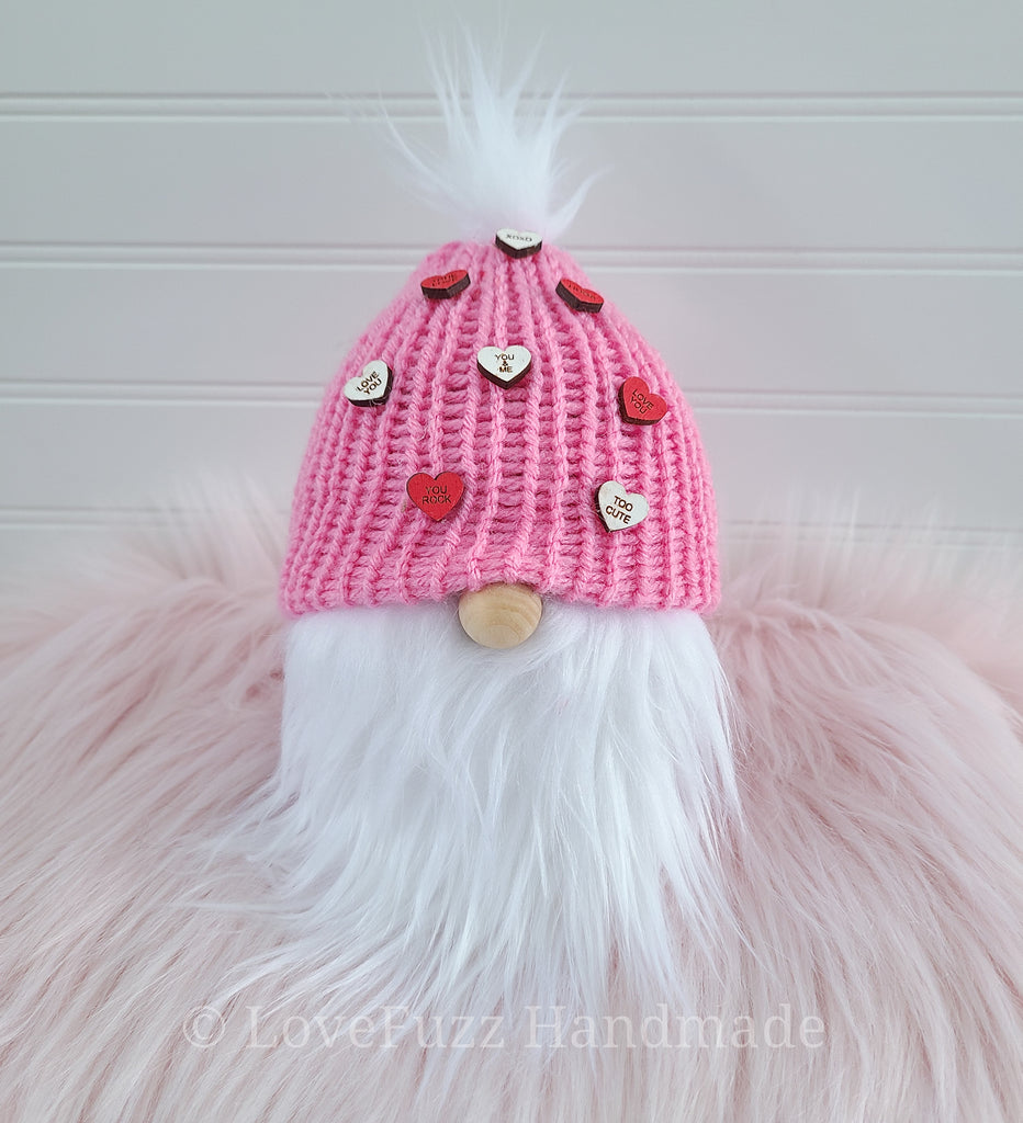 Knitted plush Valentine gnome with a pink hat covered in cute wooden conversation heart candies. Stands approx 6-7 inches tall and 4 inches wide with a weighted base.