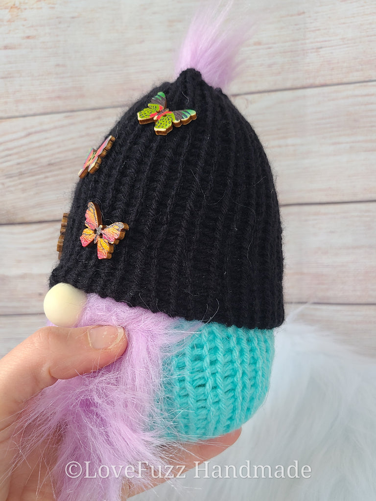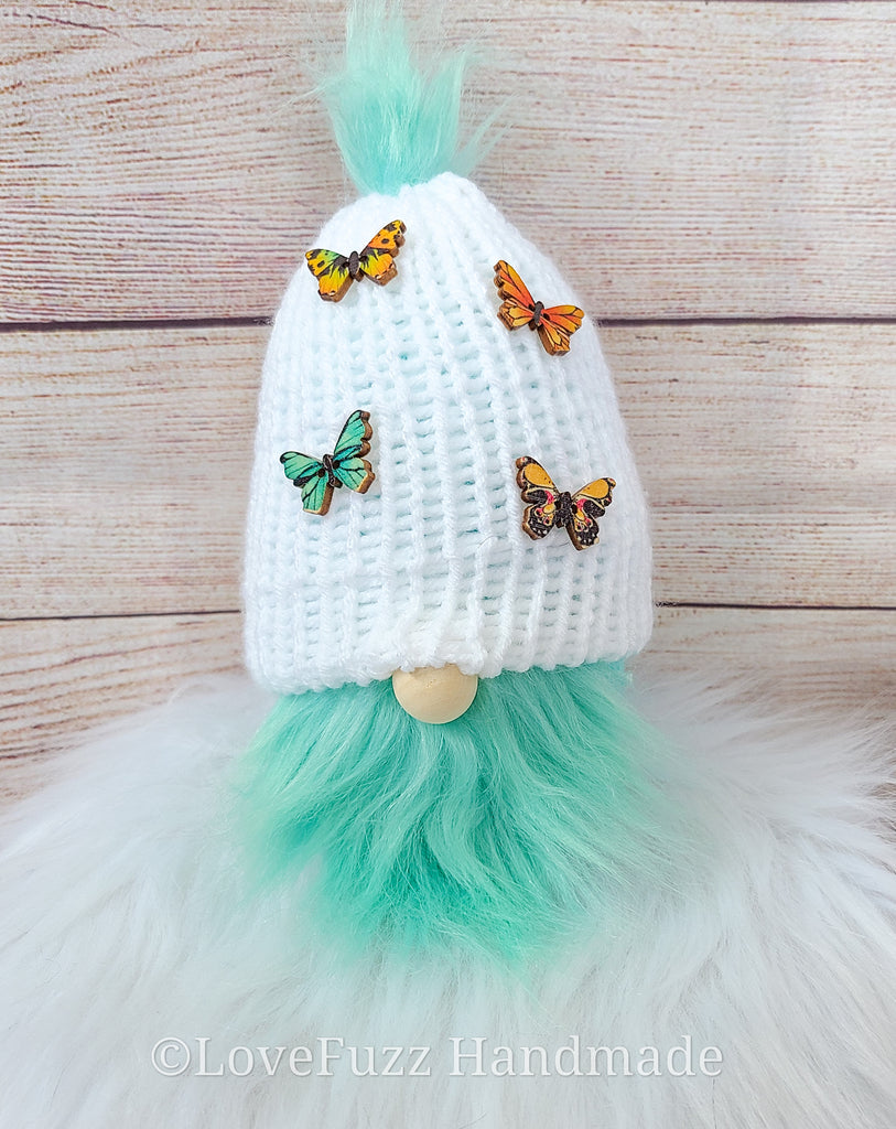 Knitted plush gnome with a white hat decorated with butterfly buttons and a fluffy light minty green beard. Stands approx 6 inches tall with a weighted base. (Last photo shows example of size)