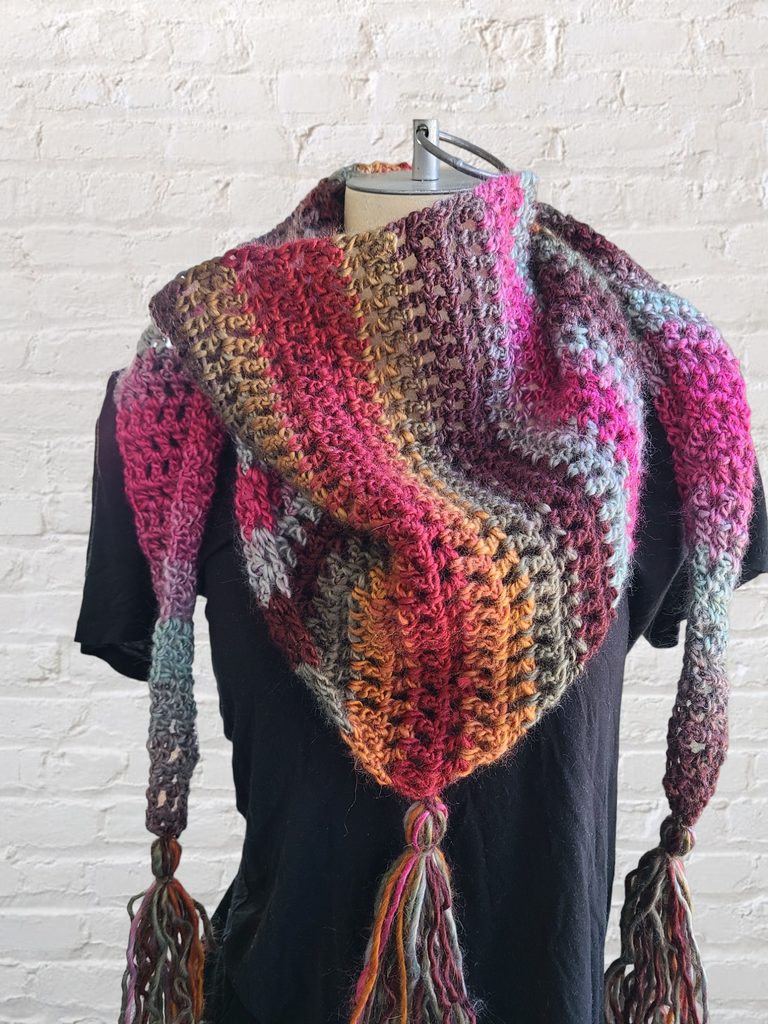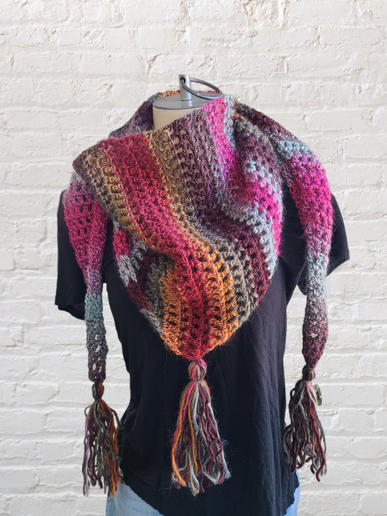 This gorgeous triangle tassel scarf is handmade with soft high end colorful acrylic yarn.