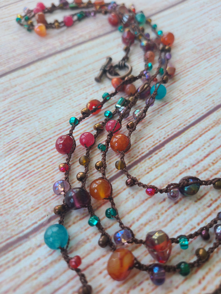 This long beaded beaded necklace is crocheted with Czech glass and agate beads on a chocolate brown cotton nylon blend cord. It's long enough to wrap 3 times for a layered look and can also be worn as a wrap bracelet.