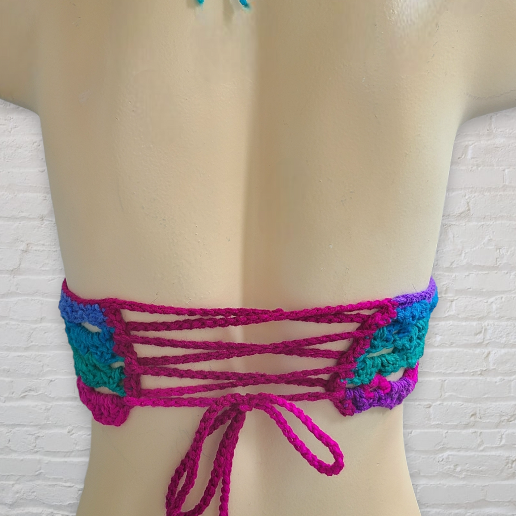 >>>This super comfortable crocheted bralette top is perfect for warm summery weather. It is made with 100% acrylic yarn in turquoise, Teal, hot pink, and purple. It ties behind the shoulders and criss crosses across the back.