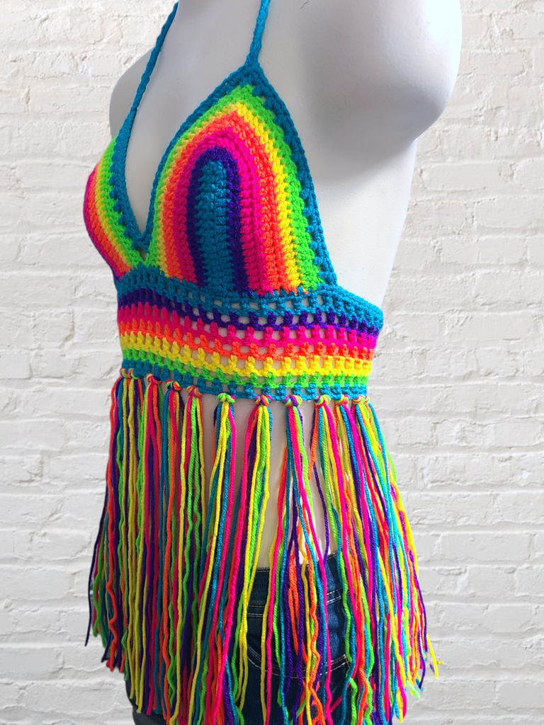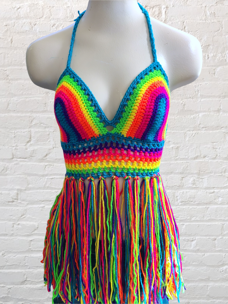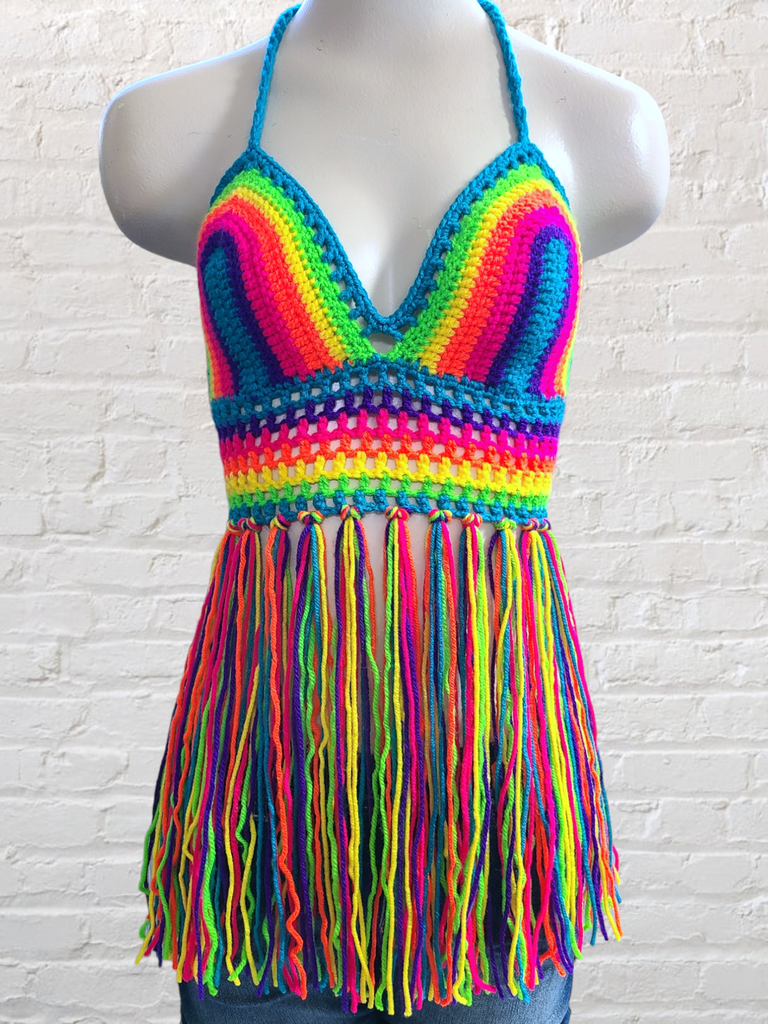 Crochet Halter Top with Fringe, Neon Rainbow Crochet Bikini Top