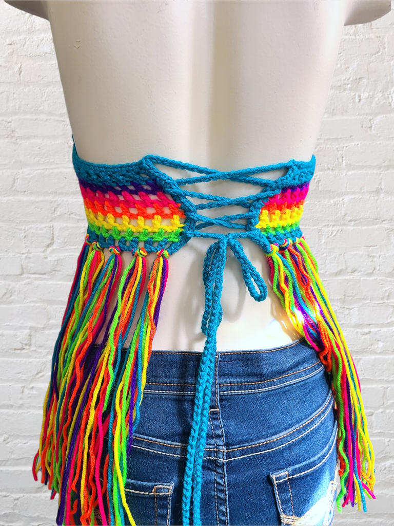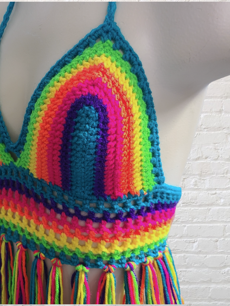 This super comfortable crocheted fringe bikini top is made with acrylic yarn in a rainbow of neon colors. It laces up the back and ties around the neck.