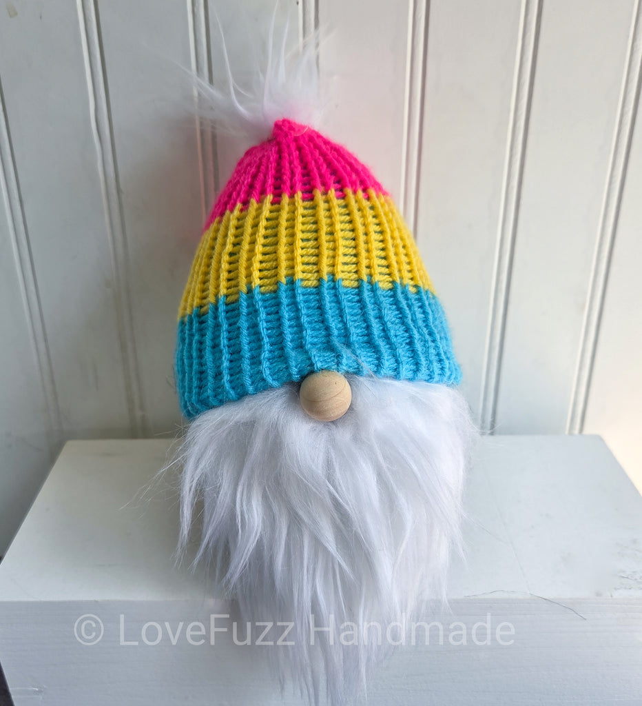Knitted plush amigurumi gnome with pansexual flag hat and a fluffy white beard. Stands approx 7 inches tall with a weighted plush base.