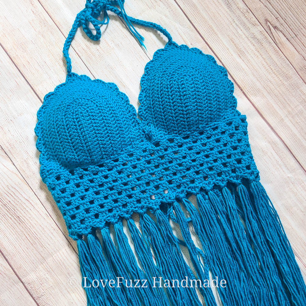This super comfortable crocheted fringe bikini top is made with 100% cotton in deep blue turquoise. It laces up the back and ties around the neck.
