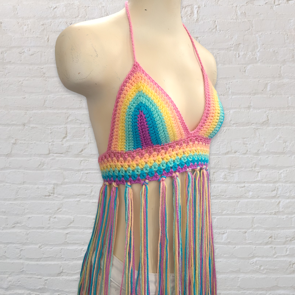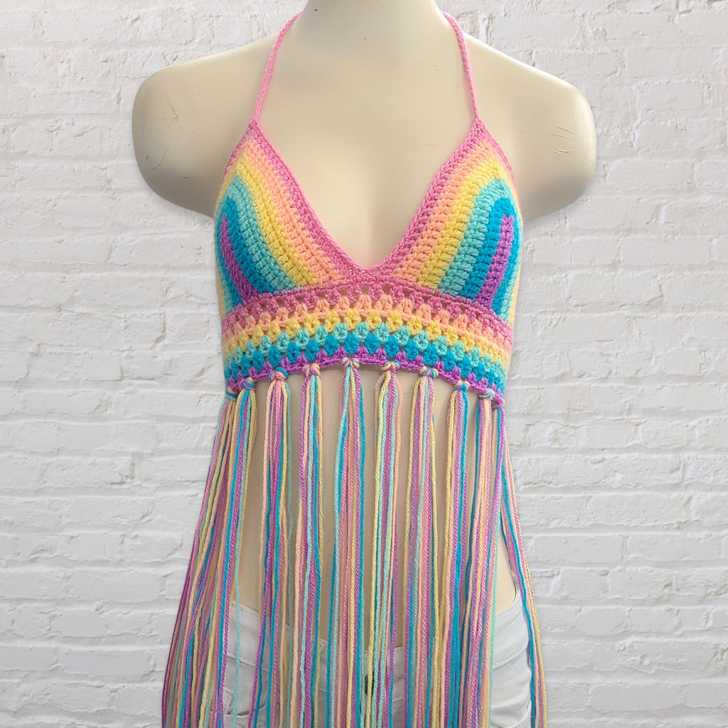 Crochet Halter Top with Fringe, Pastel Rainbow Crochet Bikini Top - LOVEFUZZ