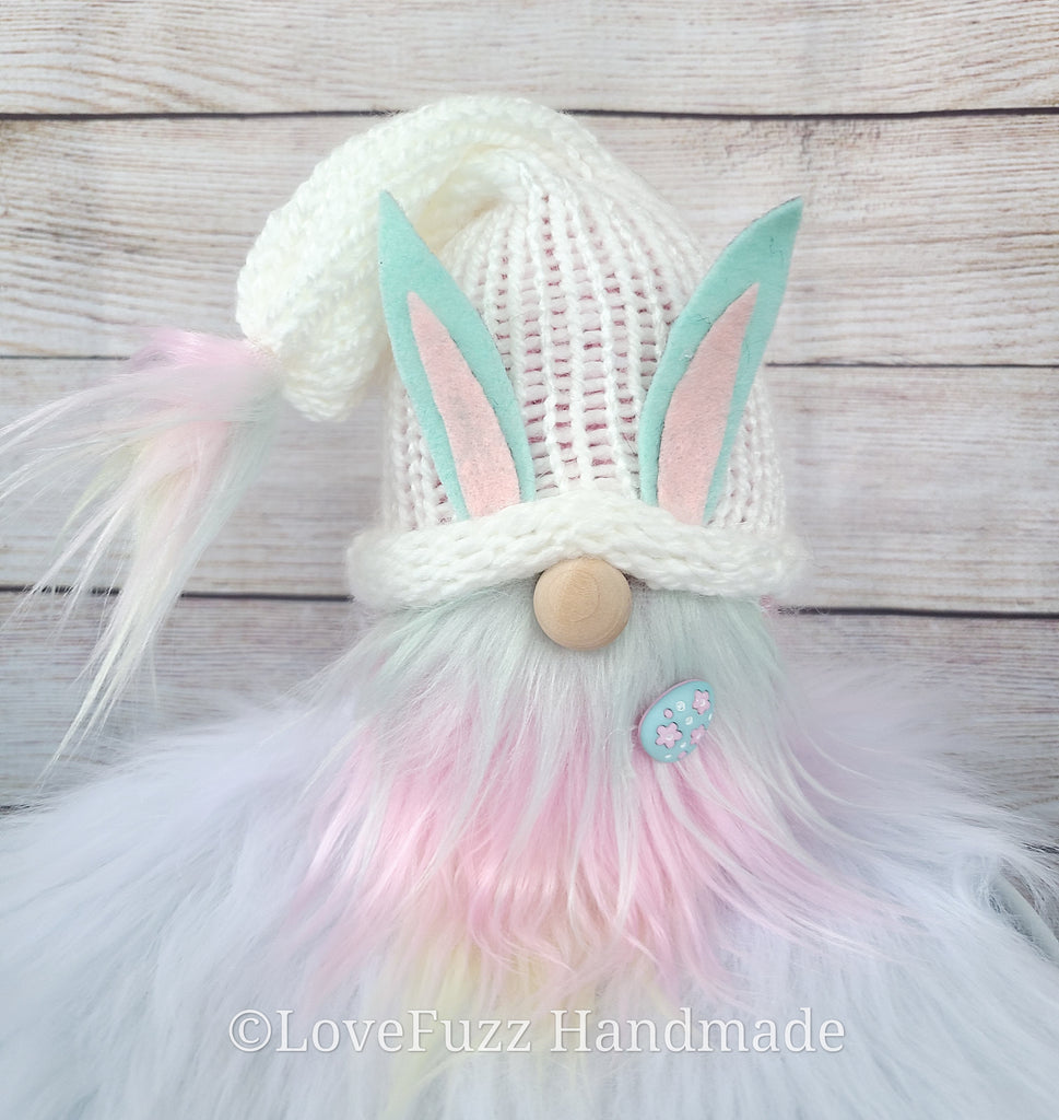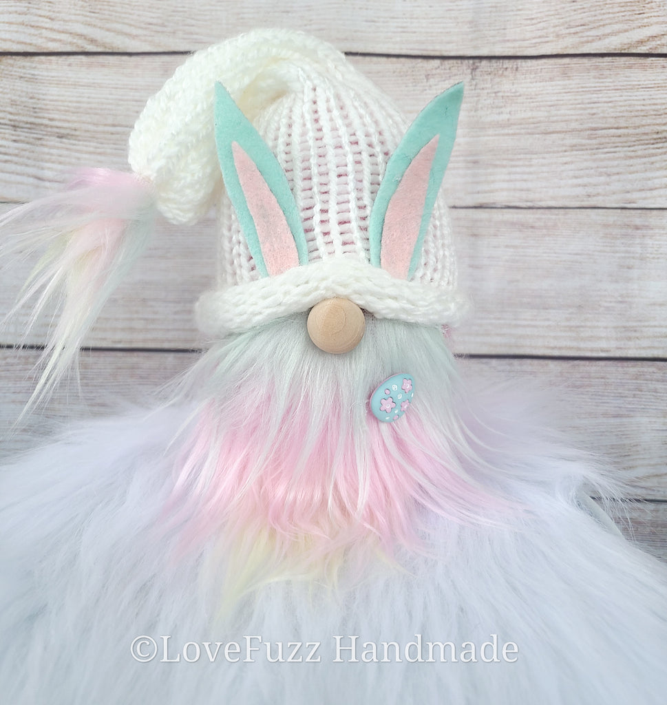 Handmade knit little Easter bunny gnome with a white hat, pastel rainbow beard, cute little bunny ears, and an Easter egg.