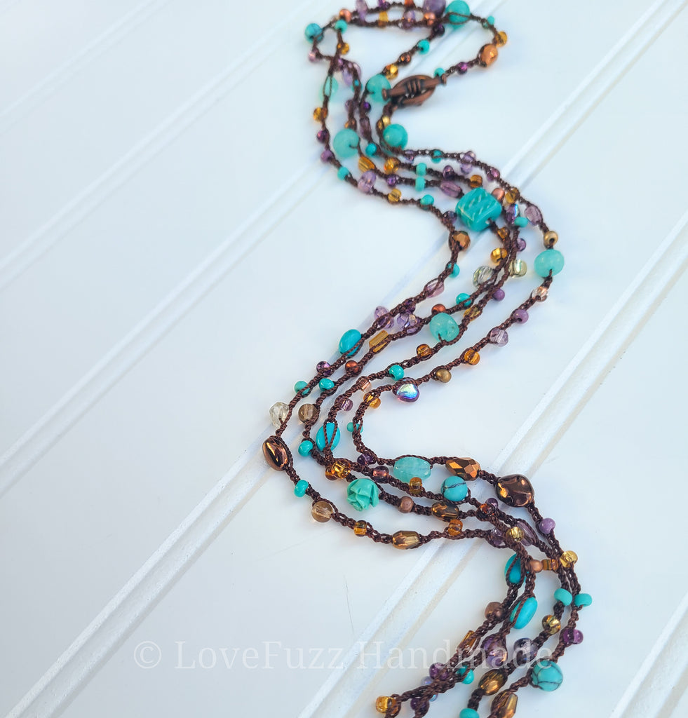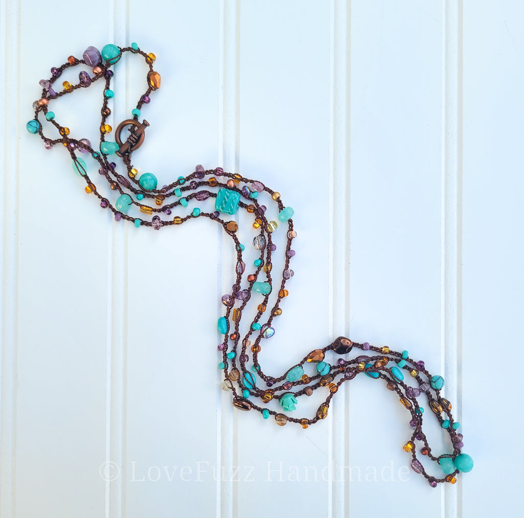 This long beaded beaded necklace is crocheted with Czech glass and turquoise beads on a chocolate brown cotton nylon blend cord. It's long enough to wrap 3 times for a layered look and can also be worn as a wrap bracelet.