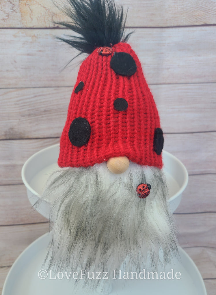 Knitted plush gnomes with spotted ladybug hats, one with a graying beard, and the other with braids. Both with 3 little ladybug friends along for the ride. Stands approx 6-7 inches tall.