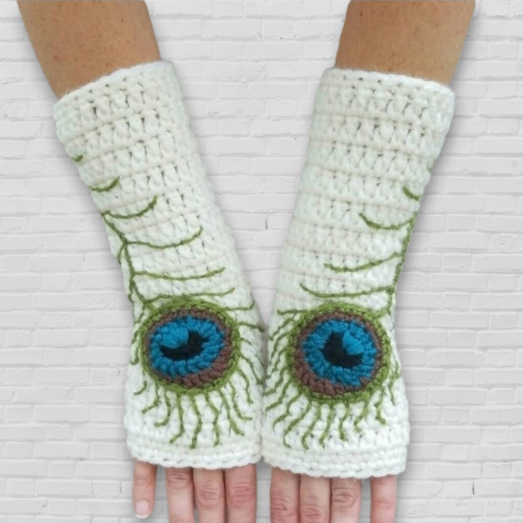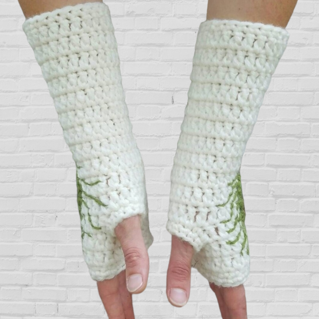 Warm and cozy arm warmers crocheted with super soft acrylic wool blend yarn in cream with a hand embroidered Peacock feather.