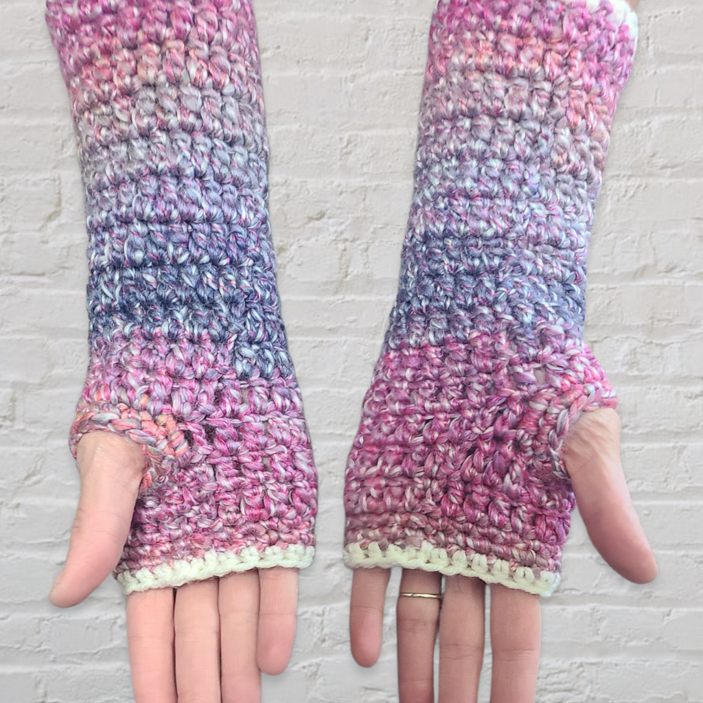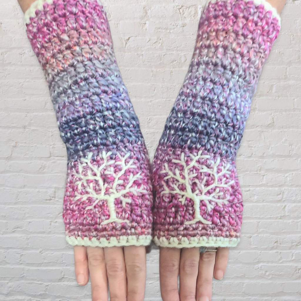 Warm and cozy arm warmers crocheted with super soft 100% acrylic yarn in varying shades of pink, purple, and cream with a hand embroidered tree design in cream.
