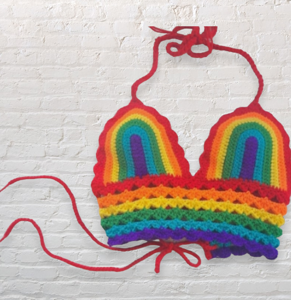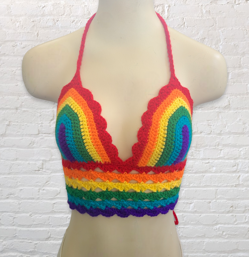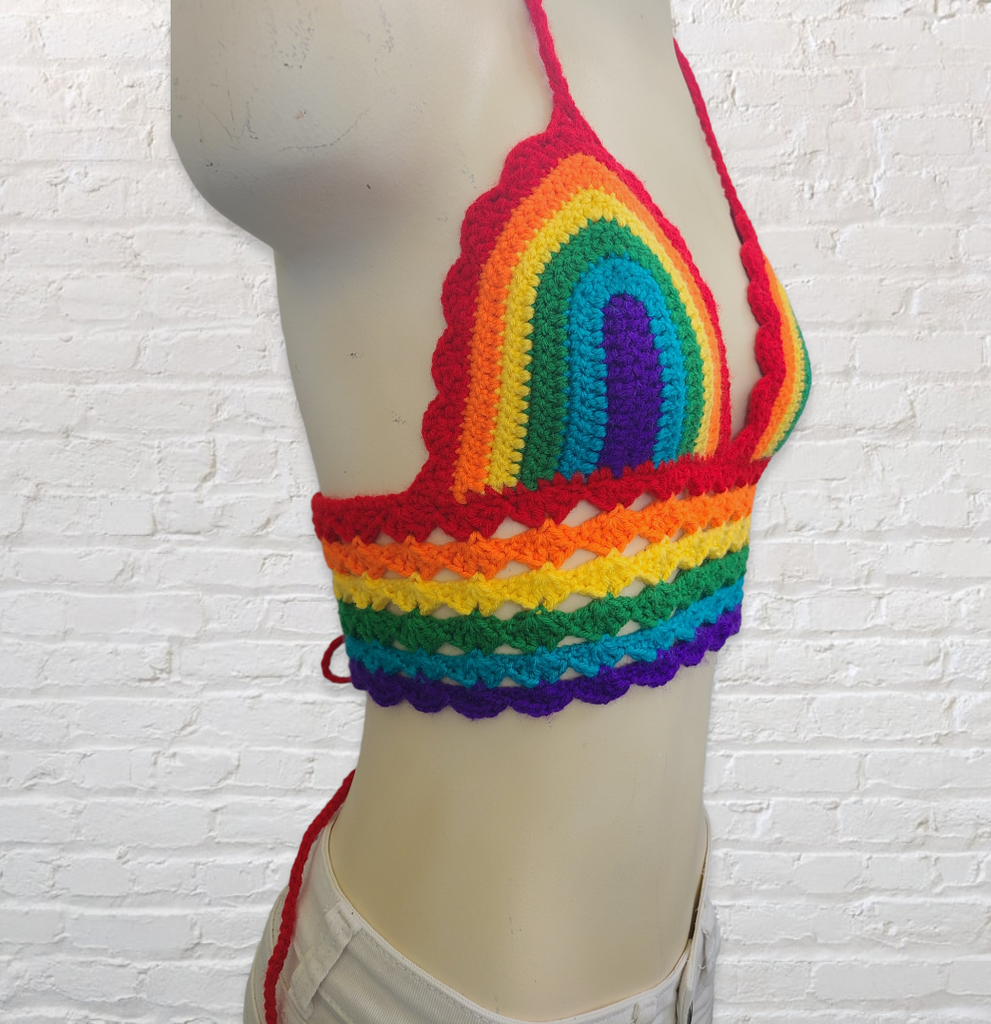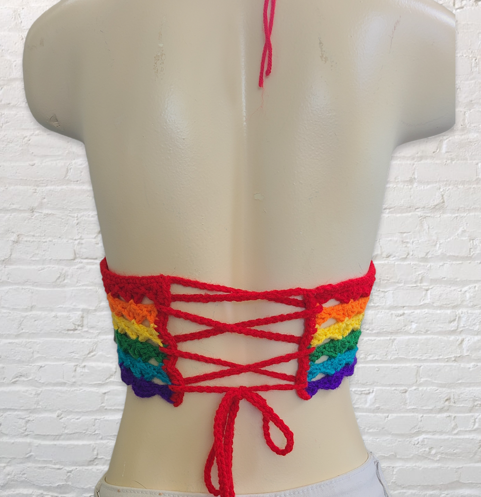 >>>This super comfortable crocheted bralette top is made with acrylic yarn in bright rainbow colors. It laces up the back and ties around the neck.