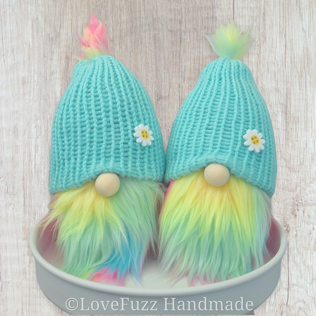 Handmade knit plush gnome with an aqua blue hat with a cute daisy button and a colorful beard. Beard colors may vary with shades of pink, purple, blue, yellow, and peach. Stands approx 6-7 inches tall with a weighted base.