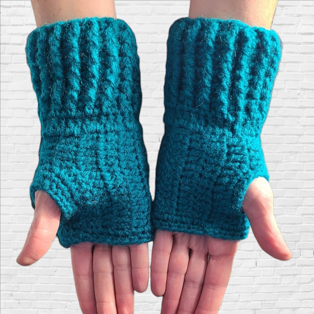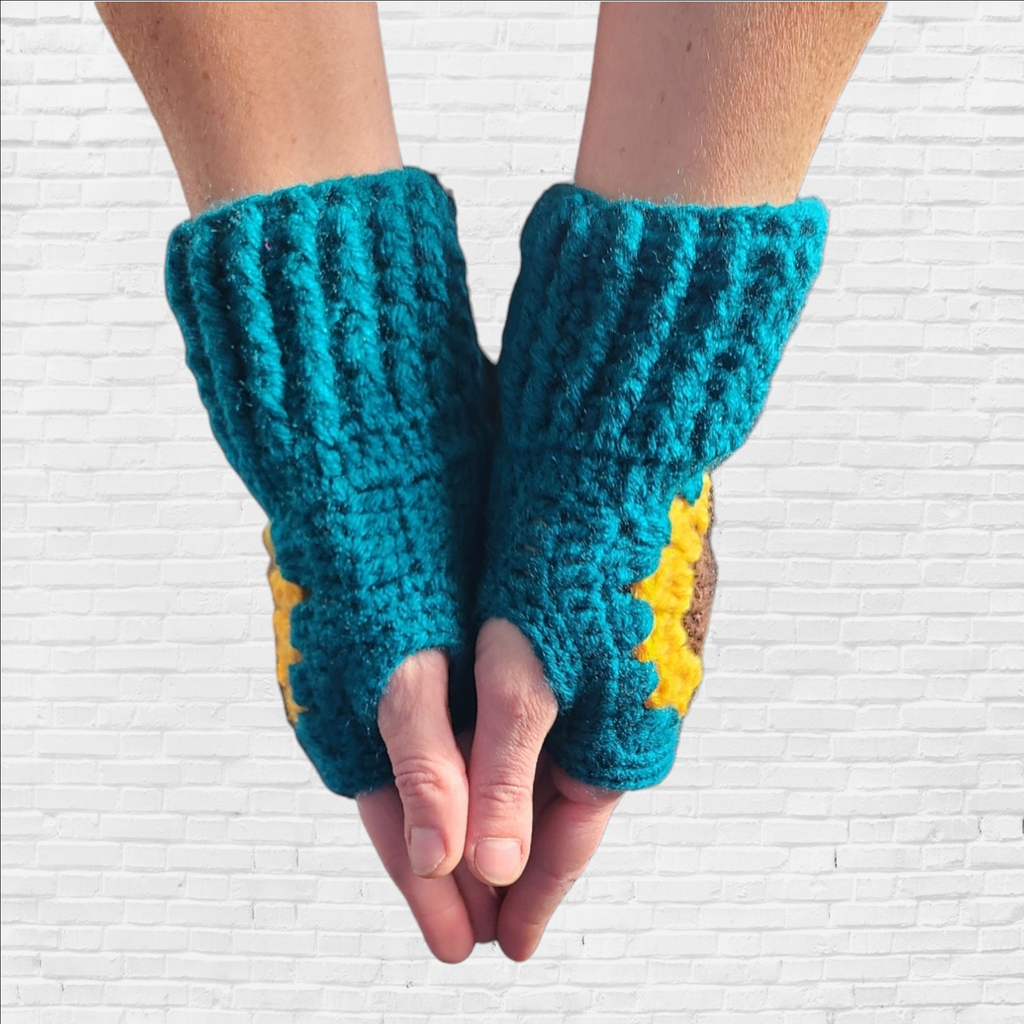 Warm and cozy arm warmers crocheted with super soft 100% acrylic yarn in teal with a Sunflower design.