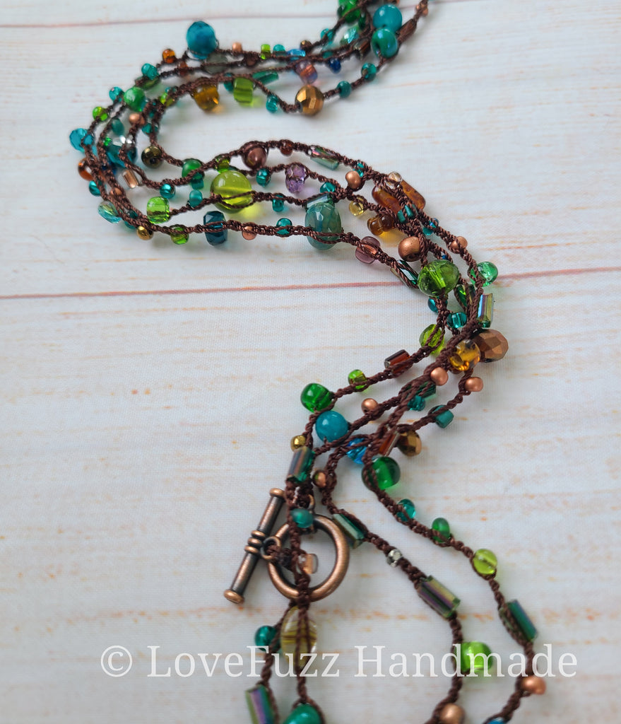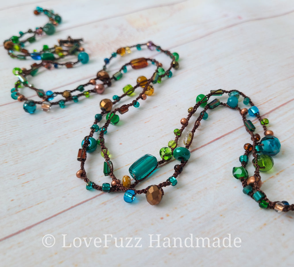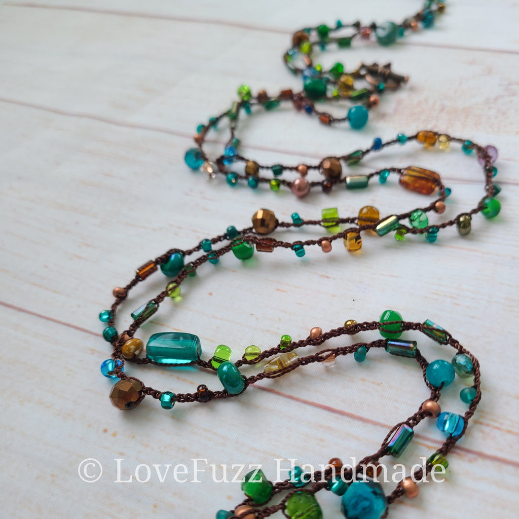 This long beaded necklace is made with a shimmering mix of teal, emerald, copper, and green glass beads crocheted on brown nylon thread, making it both waterproof and durable.