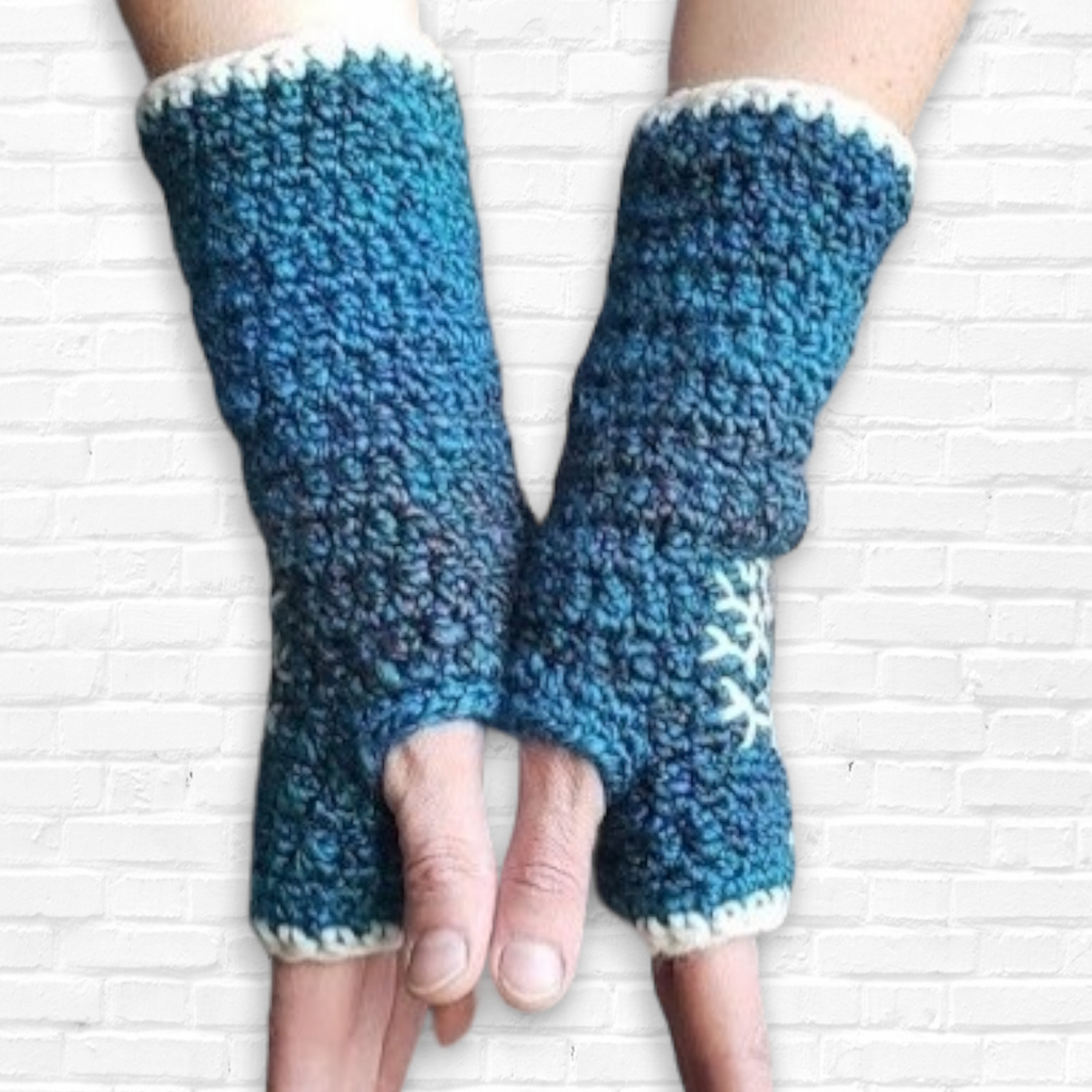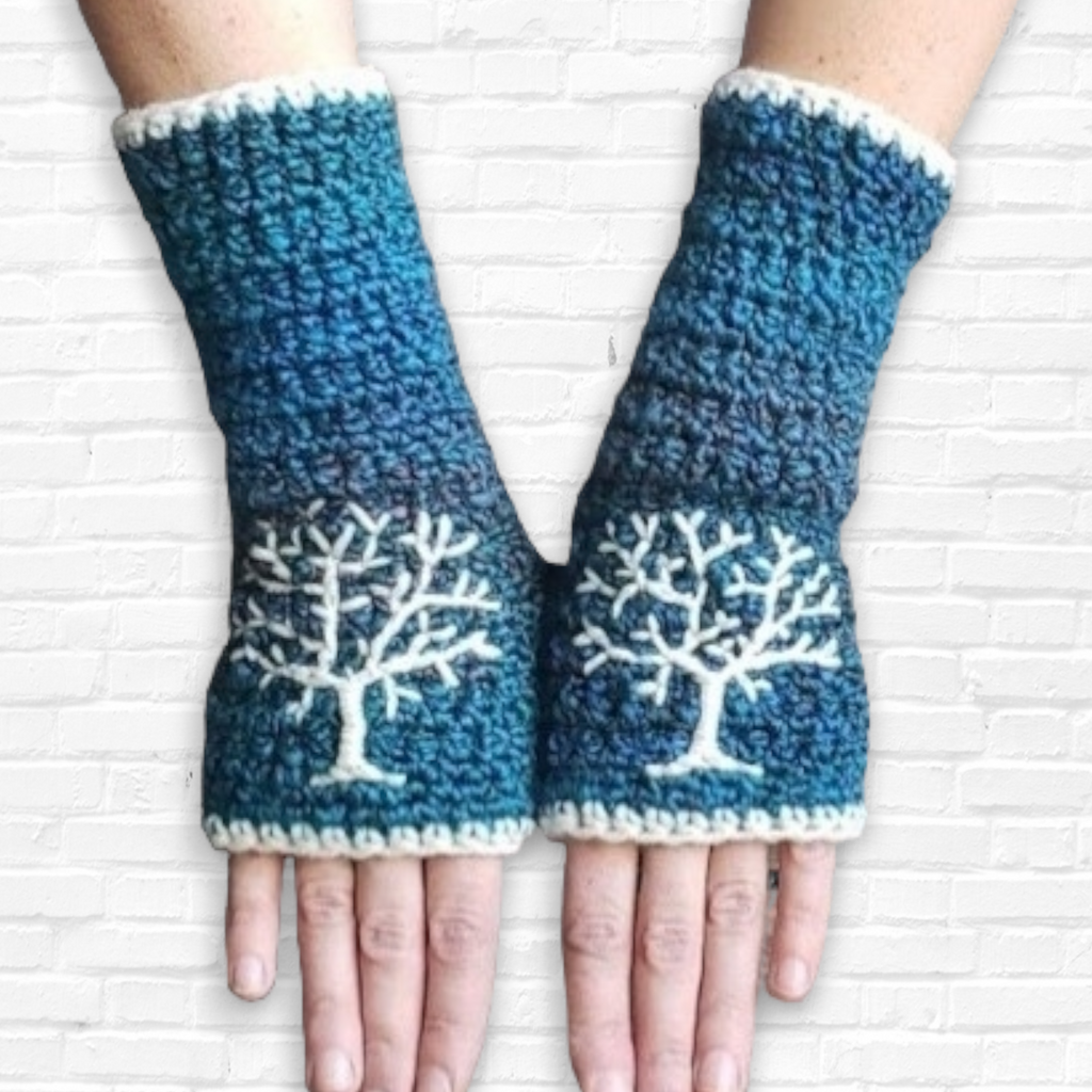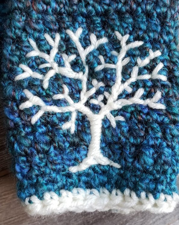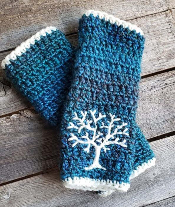Warm and cozy arm warmers crocheted with super soft 100% acrylic yarn in varying shades of green, blue, teal, and cream with a hand embroidered tree design in cream.