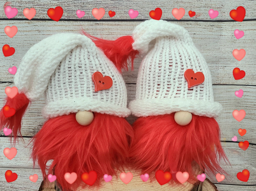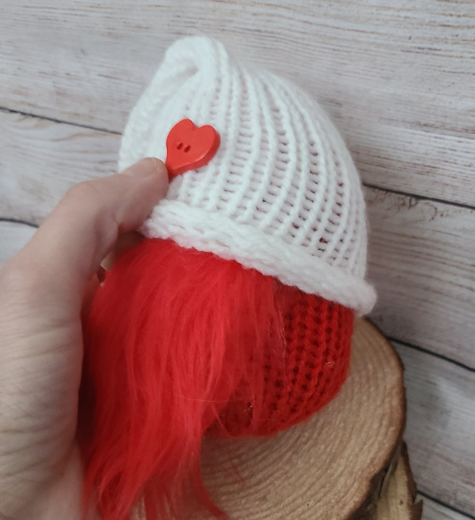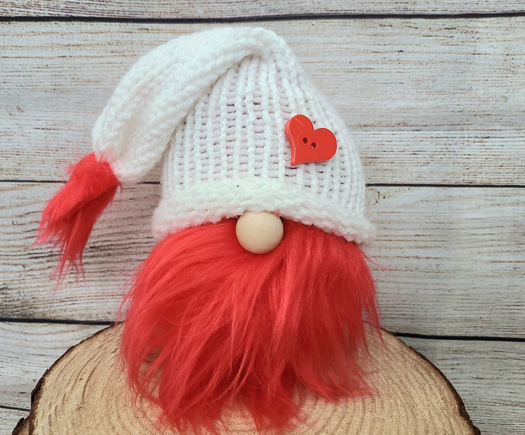 Knitted plush gnome with a fluffy red beard and white hat accented with a cute heart button, Stands approx 8 inches tall with a weighted knit base.