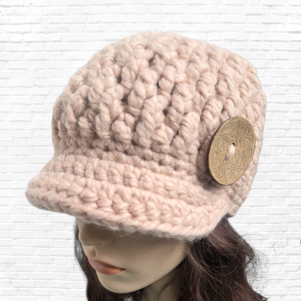 Wrap yourself in warmth and style with this hand-crocheted alpaca blend brim beanie. Crafted in a soft blush pink hue and finished with a beautifully detailed wooden button, this hat blends timeless charm with modern comfort.