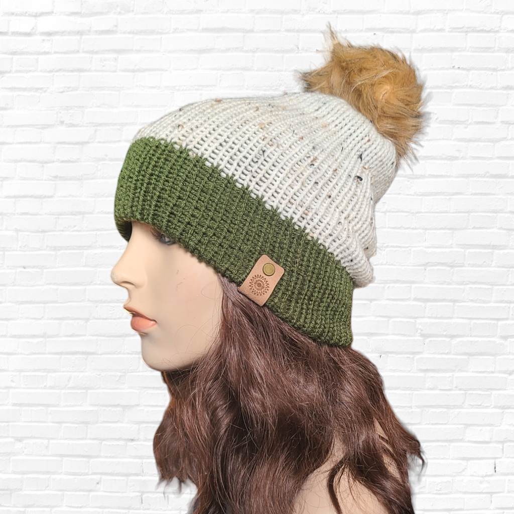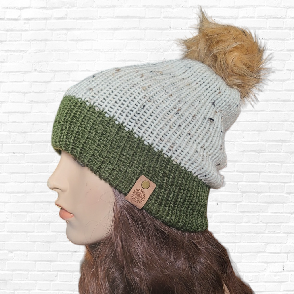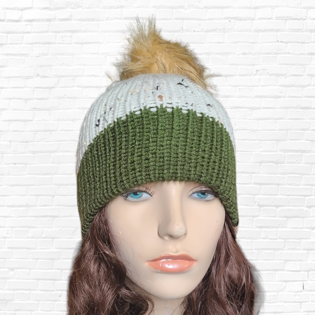>>>Knit hat in a tweed cream yarn with dark green border and tan fur pom.
