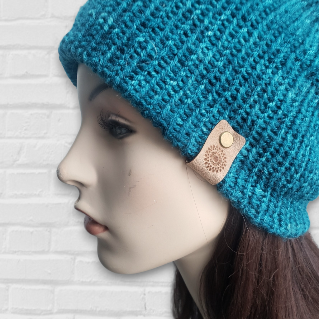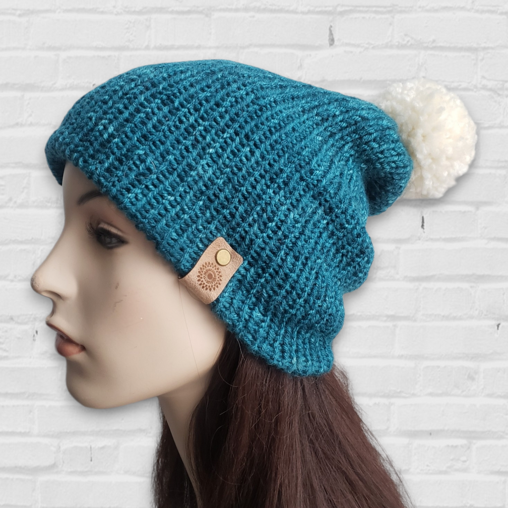 >>>Knit hat in a tweed teal yarn with a cream yarn pom.