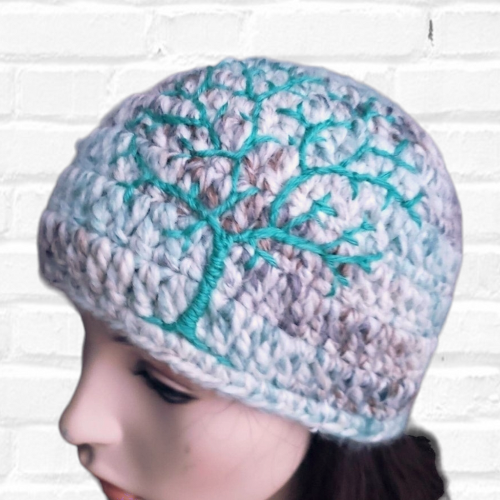 This beanie is made with soft 50% wool/ 50% acrylic yarn in cream, teal, and gray. It has an embroidered tree of life design in teal