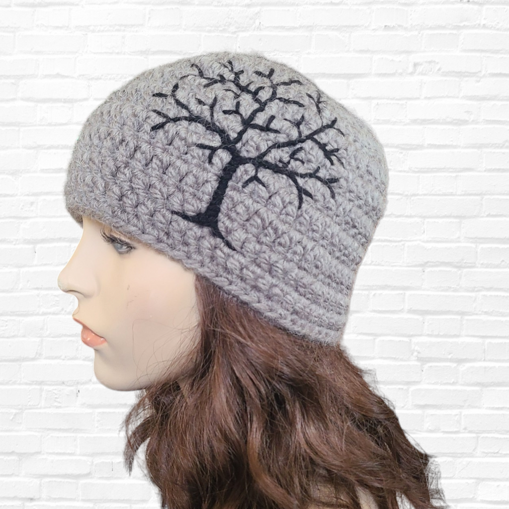 This beanie is made with soft 50% wool/ 50% acrylic yarn in gray. It has an embroidered tree of life design in black.